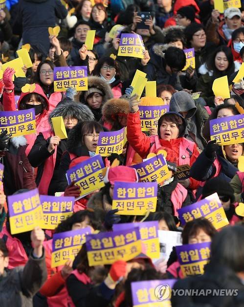 (서울=연합뉴스) 홍해인 기자 = 한일 일본군 '위안부' 합의 무효 전국행동에 참여한 시민사회단체 회원들이 30일 오후 서울 태평로 서울광장에서 열린 '한일합의 무효선언 전국행동의 날' 행사에서 손팻말과 함께 한국정신대문제대책협의회의 '일본군 위안부 할머니와 손잡는 정의기억재단' 출연금 모금 노란 봉투를 들어 보이고 있다. 2016.1.30
