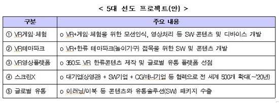미래부는 5대 선도 프로젝트를 추진하기 위해 이를 위해 기존 개별기업 단위로 지원하는 소형과제에서 벗어나 SW+콘텐츠(창작, 스토리 등)+디바이스 기업 등의 컨소시엄을 대상으로 R&D, 인력양성 및 제작인프라 등 지원사업을 통합·대형화함으로써, 신시장과 플랫폼을 선점한다는 전략이다.