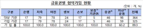 각 금융협회가 지난 19∼29일 회원사를 상대로 협약 내용을 설명하고 가입을 받은 결과 가입대상이 되는 364곳 가운데 325곳(89.3%)이 가입 절차를 마쳤다.