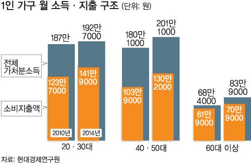 롯데마트는 최근 간편가정식 자체 브랜드 ‘요리하다’를 출시했다. 완성품으로 나오는 기존 간편가정식과 달리 반조리 형태의 제품도 포함하는 게 특징이다. ‘고급간편식’을 지향하는 ‘피코크’라는 이마트의 브랜드도 있다. 2009년 7000억원대 규모에서 2014년 1조7000억원 규모로 성장한 간편가정식 시장을 둘러싼 업계의 경쟁은 치열하다. 경기도에 건설 중인 한 오피스텔 건물은 74%를 원룸형 구조로 채웠다.‘먹방 프로그램’은 쉽고 간단하게 따라 만들 수 있는 요리법을 제공해 젊은 층을 인기를 끌고 있고, 식당·노래방·카페 등에는 ‘나홀로 라운징’(혼자 사색을 하거나 취미활동을 즐기는 것)을 선호하는 고객을 겨냥한 1인용 좌석이 늘고 있다. ‘1인 가구 전성시대’의 변화상을 꼽는 건 어렵지 않다. 간단하게 먹고, 자고, 즐길 수 있는 상품에 대한 이들의 욕구에 따라 시장이 크게 변했다. 게다가 적극적인 소비성향까지 갖췄다. 통계청이 작성한 2014년 평균소비성향에 따르면 1인 가구의 소비성향은 80.5%로 전체 가구(73.6%)보다 6.9%포인트 높다. 100만원을 번다고 가정하면 1인 가구는 80만5000원을, 2인 이상 가구는 73만6000원을 쓴다는 의미다. 산업연구원 박지혜 연구원은 1인 가구의 문화서비스 지출 행태를 분석한 보고서에서 “맞춤형 문화 서비스와 상품 개발이 필요하다”고 제안했다.