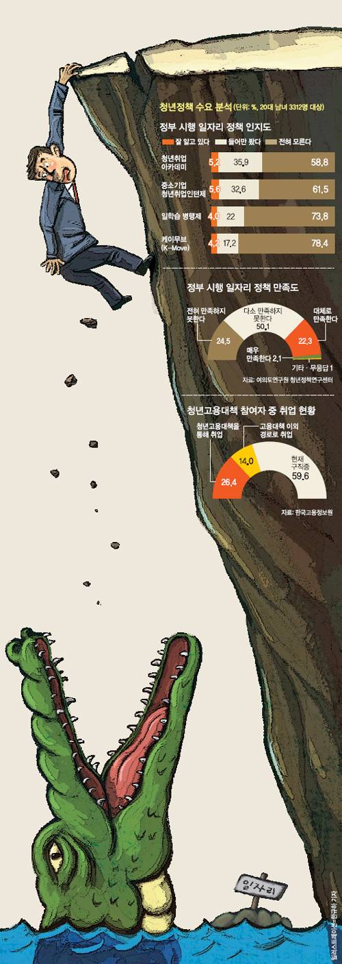 31일 새누리당의 여의도연구원 청년정책연구센터가 지난해 10월 전국 6대 권역 20대 남녀 3312명을 대상으로 조사한 바에 따르면 중소기업 청년취업인턴제에 대해 “잘 알고 있다”는 응답은 5.6%에 불과했다. “전혀 모른다”는 61.5%였다. 해외취업 지원 프로그램인 K-무브에 대해선 “잘 알고 있다”가 5%였다. “전혀 모른다”는 78.4%였다.
