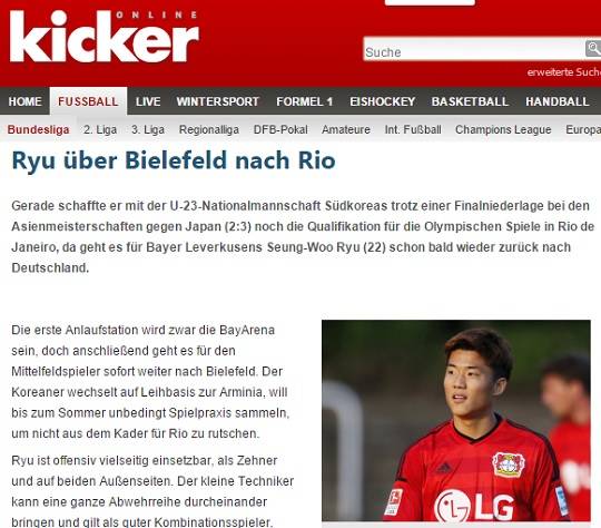 독일의 ‘키커’는 1일(한국시간) “류승우가 리우데나네이루 올림픽을 위해 올 시즌 종료까지 빌레펠트로 임대를 떠난다. 계약기간은 올 시즌이 끝날 때 까지다”라며 “다재다능한 류승우는 좋은 선택이 될 것”이라고 전했다.