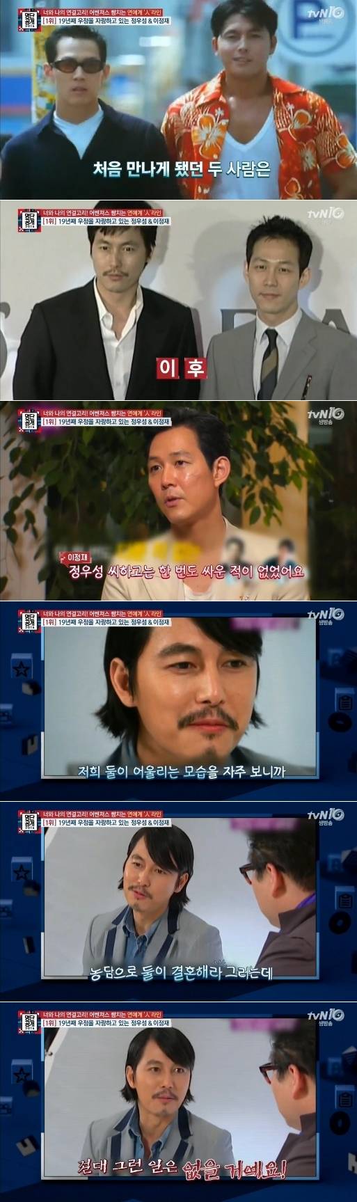 이정재는 정우성과 1998년 영화 '태양은 없다'에 출연하며 19년째 우정을 이어오고 있다.