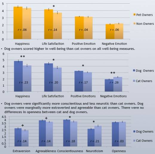 다만 고양이나 개 등 반려동물의 종류와 상관없이 애완동물을 키우는 것 자체가 키우지 않는 것보다 삶의 만족도는 더 높은 것으로 나타났다. 행복도와 삶의 만족도 등의 항목에서 반려동물을 키우는 사람의 점수가 더 높았고, 부정적인 감정 항목에서는 반려동물을 키우지 않는 사람의 점수가 더 높았다.