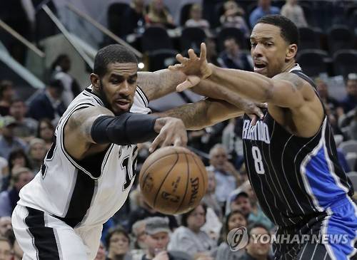 San Antonio Spurs forward LaMarcus Aldridge (12) and Orlando Magic forward Channing Frye (8) reach for a loose ball during the second half of an NBA basketball game, Monday, Feb. 1, 2016, in San Antonio. San Antonio won 107-92. (AP Photo/Eric Gay)