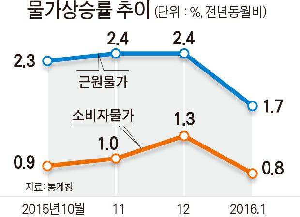 2014년 12월부터 11개월 동안 0%대를 벗어나지 못했던 소비자물가 상승률은 지난해 11월(1.0%)과 12월(1.3%) 두 달 연속 1%대로 진입했지만, 지난달에 다시 0%대로 내려앉은 것이다.