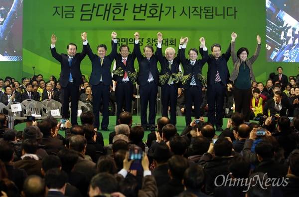 | ▲ 총선 승리 다짐하는 국민의당 지도부 2일 오후 대전 중구 한밭체육관에서 열린 국민의당 중앙당 창당대회에서 초대 공동대표로 선출된 안철수, 천정배 공동대표가 김한길 선대위원장, 최고위원들과 함께 정권교체와 총선 승리를 다짐하며 지지자들을 향해 손을 들어보이고 있다. (사진왼쪽부터 박주선, 주승용 최고위원, 천정배 공동대표, 한상진 공동 창준위원장, 김한길 선대위원장, 안철수 공동대표, 김성식, 박주현 최고위원) |