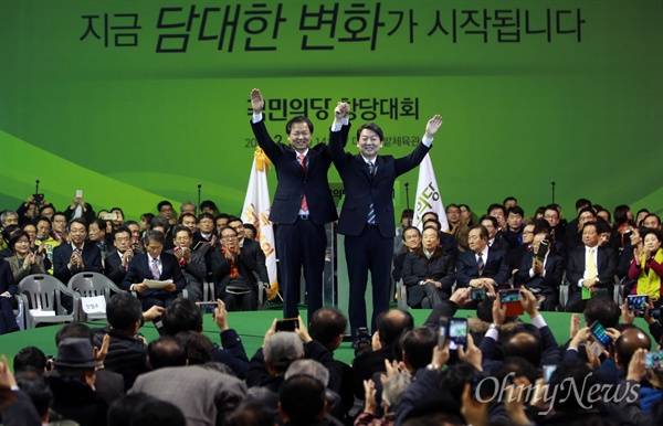 | ▲ 국민의당 초대 공동대표로 선출된 안철수-천정배 2일 오후 대전 중구 한밭체육관에서 열린 국민의당 중앙당 창당대회에서 초대 공동대표로 선출된 안철수, 천정배 공동대표가 지지자들을 향해 손을 들어보이며 인사하고 있다. |