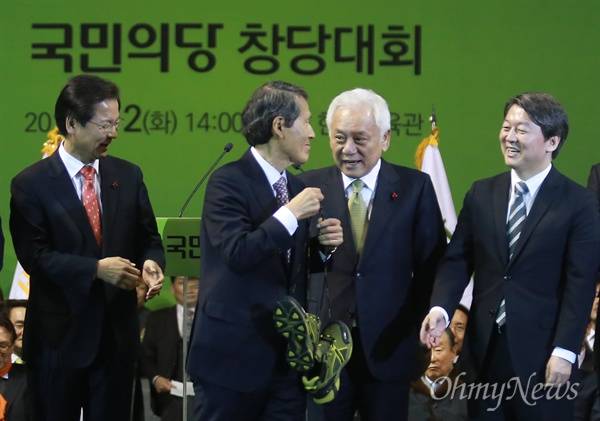 | ▲ 한상진, 안철수-천정배 신발 선물 '발바닥에 땀 나도록 뛰어달라' 2일 오후 대전 중구 한밭체육관에서 열린 국민의당 중앙당 창당대회에서 한상진 공동 창당준비위원장이 안철수, 천정배 공동대표에게 총선 승리에 최선을 다해 달라며 신발을 선물하고 있다. |