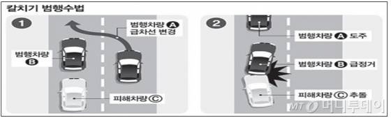 칼치기란 사전에 약속된 신호에 따라 범행차량이 급차선 변경(칼치기)을 한 후 도주하면 공범차량이 급브레이크를 밟아 앞차와 안전거리를 확보하지 못한 후행차량의 후미추돌 사고를 유발해 미수선수리비 등 합의금을 부당 편취하는 사기수법이다.