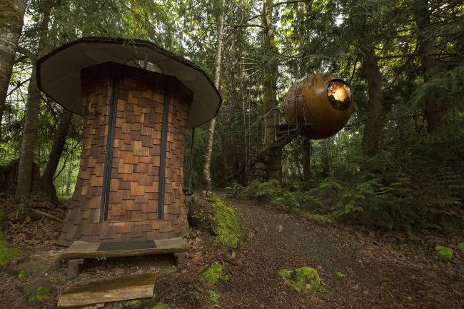 ▶프리 스프리트 스피어(캐나다 브리티시컬럼비아)=해변가 숲 속에 위치하고 있다. 나무에 매달린 듯한 원형 모양이다. 새로운 방식으로 자연을 느낄 수 있게 만들어졌다.