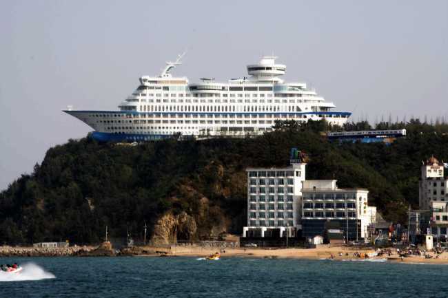 ▶썬크루즈리조트(한국)=‘땅 위에 있는 최초의 럭셔리 크루즈’라고 선전하고 있는 호텔이다. 스카이라운지에서 바다 조망이 가능하다.
