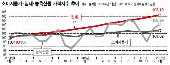 통계청이 2일 발표한 ‘1월 소비자물가 동향’을 보면, 지난달 월세와 전셋값을 포함하는 집세 상승률(전년 동월 대비)은 전달에 이어 2.9%였다. 이런 집세 상승률은 1월 소비자물가 상승률 0.8%보다 3배가 더 높으며, 전체 소비자물가를 0.28%포인트 끌어올리는 구실을 했다. 집세는 2014년 8월(2.2%) 이후 오름폭을 계속 키워왔다.