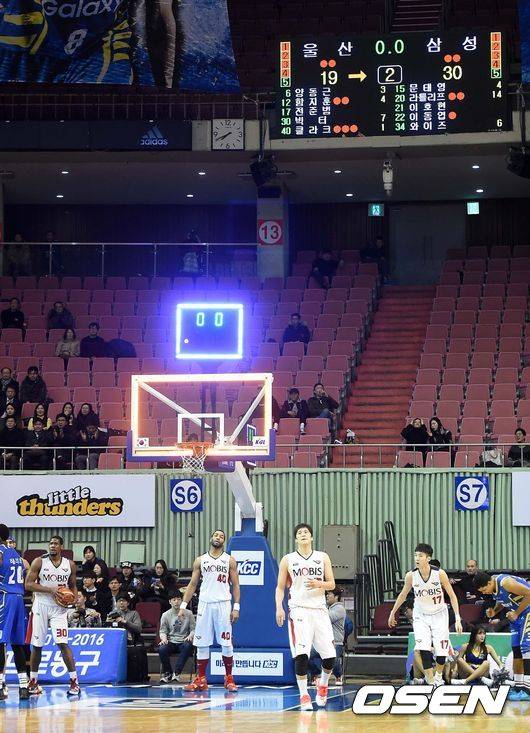 서울 삼성의 높이에 밀린 울산 모비스가 역대 팀 자체 최소 득점이라는 수모를 당했다.