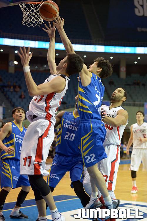 02일 잠실 실내체육관에서 열린 '2015-2016 KCC 프로농구' 서울 삼성 과 울산 모비스 의 경기, 삼성 이동엽이 모비스 전준범과 리바운드를 다투고있다.