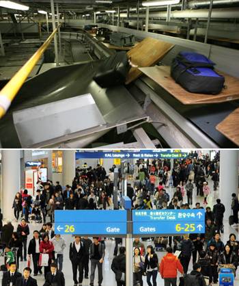 | 인천공항 수하물처리시스템(BHS) 고속벨트.(사진 위) 인천국제공항 출국장이 비행기 탑승을 기다리는 여행객들로 붐비고 있다.(사진 아래) |