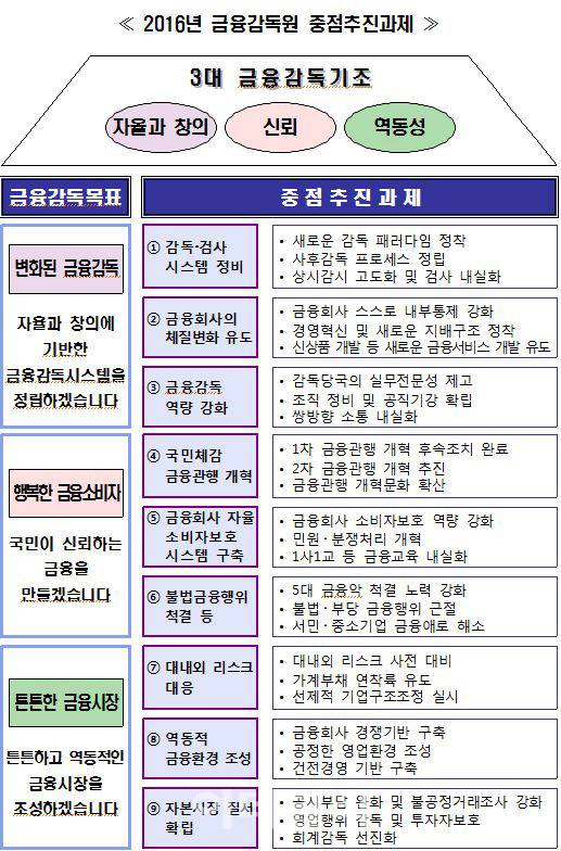 금감원이 제시한 9대 중점추진과제는 △감독 및 검사 시스템 정비 △금융회사의 체질변화 유도 △금융감독 역량 강화 △국민 체감 금융 관행 개혁 △금융회사 자율소비자보호 시스템 구축 △불법금융행위 척결 △대내외 리스크 대응 △역동적 금융환경 조성 △자본시장 질서 확립 등이다.