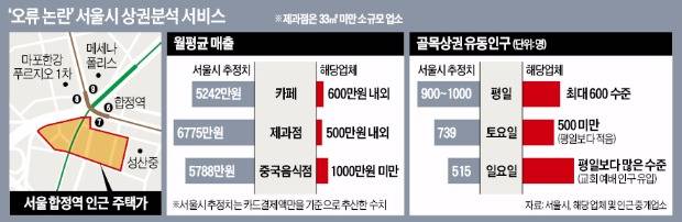이곳 상인들의 얘기는 보고서와 크게 달랐다. 기존 합정역 상권과 왕복 4차선으로 단절돼 유동인구가 적은 곳으로 서울시 추정 매출은 크게 과장됐다는 설명이다. 상인들과 중개업소에 따르면 소규모 카페의 월평균 매출은 500만~600만원, 제과점은 500만원 내외였다. 이곳에서 5년째 영업 중인 고신웅 ‘카페 쓰리고’ 사장은 “이 골목 카페 대부분이 월 매출 500만원 내외”라고 말했다.
