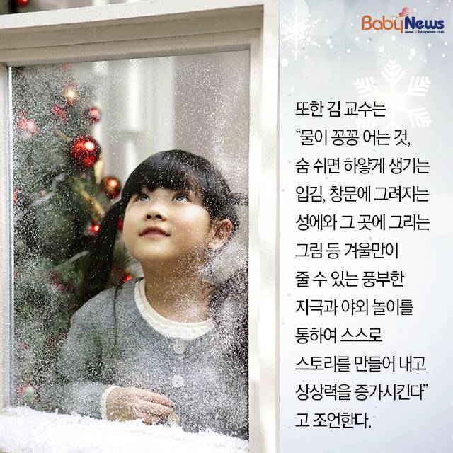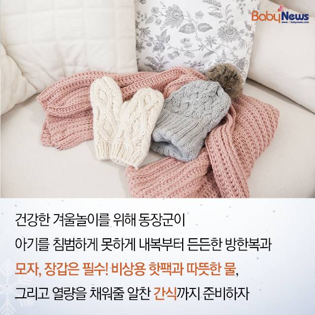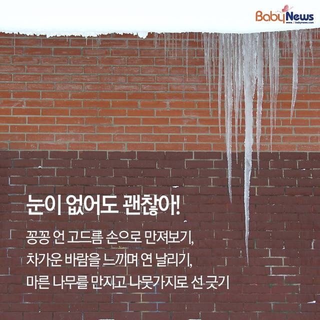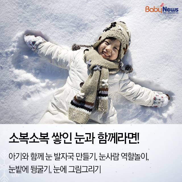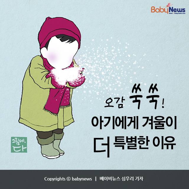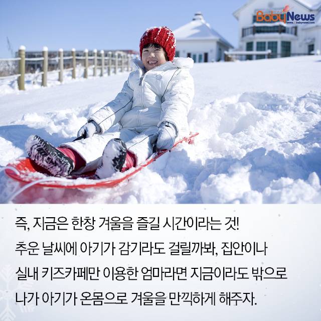 최근 대한민국을 강타한 한파가 한풀 꺾였음에도 불구하고, 엄마들은 아기와의 외출이 두렵다. 병원이나 문화센터 등 꼭 필요한 외출만 하는데도 혹여 감기에 걸리지는 않을까 방한복부터 모자, 장갑, 목도리, 핫팩 등 챙겨야 할 것이 한두 개가 아니다. 겨울 추위에 노심초사하는 엄마의 마음처럼 과연 아기들에게도 겨울은 두려운 존재일까? 답은 'NO'다. 엄마에게는 평범하기만 한 겨울이지만 아기들에게는 특별한 계절이기 때문이다. 특히 이제 막 걷기 시작한 생후 12개월부터 호기심으로 가득한 36개월까지는 뇌발달학적으로 시냅스가 폭발하는 시기이기에 겨울이 주는 즐거움은 아기에게 상상하지 못한 풍부한 자극을 선물한다. 아기들의 신나는 겨울을 보내기 위해 엄마들이 꼭 알아야 할 모든 것을 카드뉴스로 정리했다.
