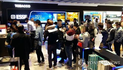 사진은 지난 3일 인천국제공항 면세점 담배판매 매장에서 해외출국 승객과 외국인들이 담배를 사고 있는 모습. 2016.2.4