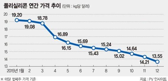 태양광 산업의 기초재료인 폴리실리콘 가격이 지난 해부터 지속적으로 하락하면서 관련 업계의 시름이 깊어지고 있다. 지난 2010년엔 ㎏당 80달러도 넘겼던 폴리실리콘 가격은 2015년 초 19.20달러에서 시작해 같은 해 12월엔 13.55달러까지 추락했다. 이에 추가 공장 증설을 중단, 공장 설립 계획 취소가 잇따르고 있다.