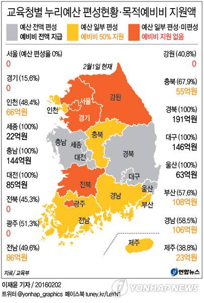 서울 외에 전북, 광주, 강원, 경기에서도 어린이집 예산이 교육청 차원에서는 전액 미편성됐다. 이 지역 교육감들은 어린이집은 보건복지부 소관으로 정부가 예산을 부담해야 한다고 주장하고 있다.