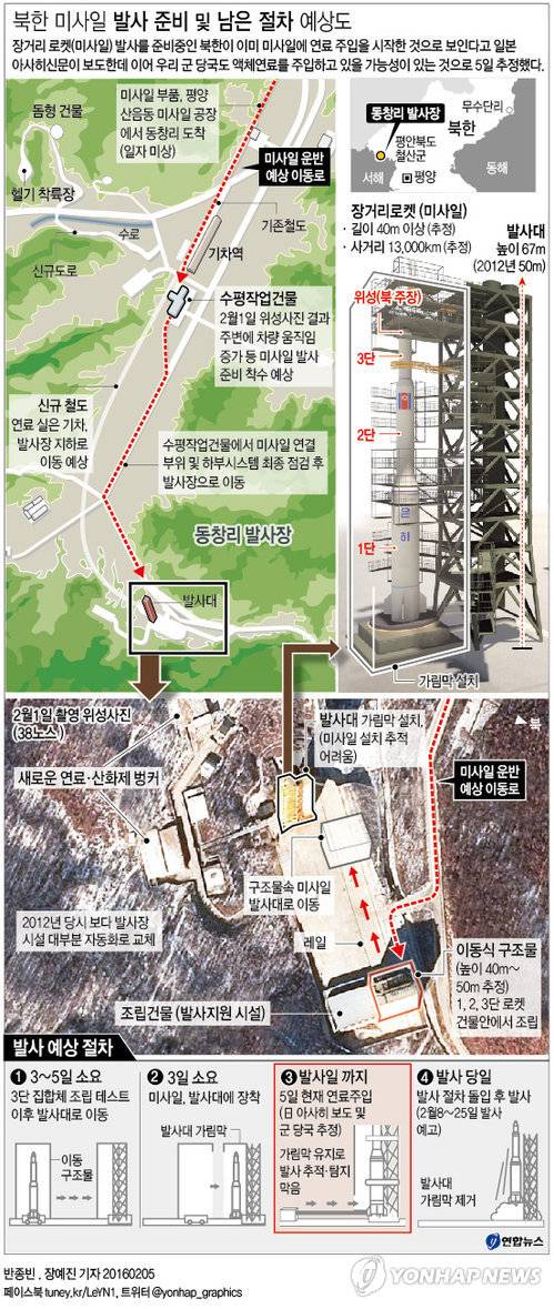 군의 한 관계자는 이날 "8일부터 언제든지 쏠 수 있도록 발사 준비를 마치기 위해 현재 연료를 주입하고 있을 가능성이 있다"고 밝혔다.