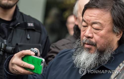 epa05144692 Chinese artist and activist Ai Weiwei takes a snap photo as he answers media questions next to his 12 sculptures installation entitled 'Circle of Animals / Zodiac Heads' in front of the National Gallery in Prague, Czech Republic, 05 February 2016. Ai Weiwei's exhibition is part of celebrations of the the Czech National Gallery's 220th anniversary. EPA/FILIP SINGER