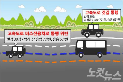 고속도로가 막힌다고 갓길로 주행하거나 고속도로 버스전용차로 통행 위반을 하면 벌점 30점에 범칙금은 승합차 7만원, 승용차 6만원이다.