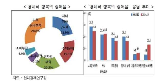현대경제연구원은 경제적 행복을 제고하기 위해 ▷노후불안을 해소할 수 있는 지원대책 ▷경제적 불평등을 완화하기 위한 주거비와 교육비 등의 경감 대책 ▷고령자들의 노후지원을 위한 일자리 대책 ▷구조개혁을 통한 경제체질 강화 등을 주문했다.