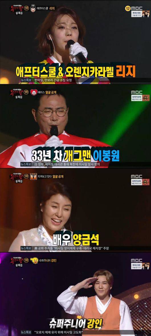 [OSEN=박소영 기자] 오렌지캬라멜 리지, 개그맨 이봉원, 배우 양금석, 슈퍼주니어 강인이 '복면가왕'을 빛냈다. 다채로운 분야의 구성진 목소리들이 설 연휴를 맞은 안방을 신명나게 만들었다.