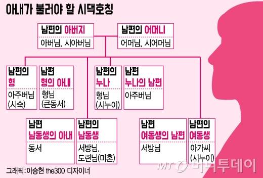 남성은 아내의 오빠가 손위면 '형님', 아래면 '처남'으로 부릅니다. 그들의 부인은 각각 '아주머니' '처남댁'이라고 하면 되고요. 아내의 언니는 '처형', 남편은 손위일 땐 '형님', 아래일 경우 '동서'라고 합니다. 아내의 여동생은 '처제'고요.