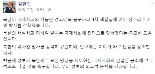 김한길 "북한 미사일 강력규탄.. 안보에 여야 없다"