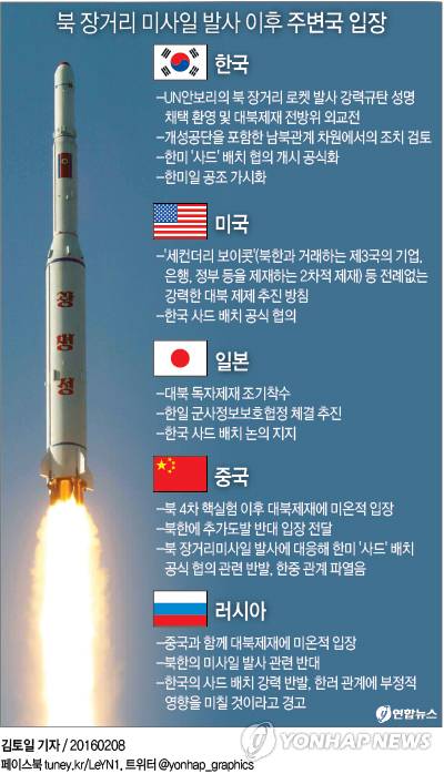 <그래픽> 북 장거리 미사일 발사 이후 주변국 입장(종합)