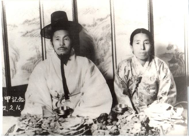 | ▲ 아버님 회갑 때 '회갑 상'을 받은 아버지와 어머니(1959년) 아버님 회갑 잔치 날 고향집 마당에서 회갑잔치상 앞에서 아버지 어머니가 함께 찍은 유일한 사진이다. |