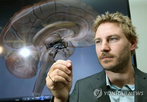 epaselect epa05150703 Dr Nicholas Opie holds a stent-based electrode called stentrode as he poses for a photograph at the Royal Melbourne Hospital, in Melbourne, Australia, 09 February 2016. A 'revolutionary' device, which is implanted within a blood vessel in the brain, made of a flexible material called nitinol and of the size of a matchstick, may one day enable paralyzed people with spinal cord injuries to walk again, according to Melbourne researchers. According to reports, in 2017 a group of selected paralyzed people from Australia will receive the implant as a trial. EPA/DAVID CROSLING AUSTRALIA AND NEW ZEALAND OUT