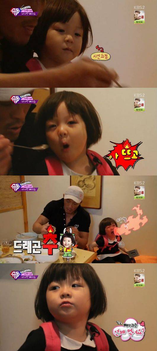 이날 방송에서 돌 무렵 즈음의 추사랑의 모습이 공개, 추성훈과 뼈다귀를 먹으러 간 추사랑은 뜨거움에 마치 불을 뿜는 듯한 모습으로 웃음을 자아냈다.