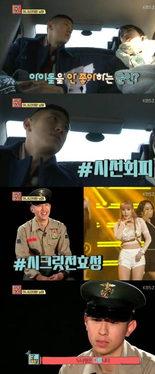 하니 동생은 제작진과 인터뷰에서 "아무래도 군인이니까. 난 개인적으로 시크릿 전효성 씨를 좋아한다. 누나랑은 다르다. 누나는.. 좀 다르다"라고 강조해 보는 이들을 폭소케 했다. (사진= KBS 2TV '우리는 형제입니다' 캡처)