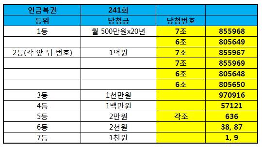 연금복권 241회 1등 '6조805649'과 '7조855968'