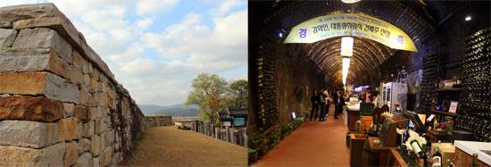 | ▲ 임진왜란 때 부서진 청도읍성(왼쪽)과, 1909년 이토 히로부미에 끌려 청도를 방문한 순종이 기차를 타고 지나갔던 와인 터널(대구와 청도 사이의 폐쇄된 철로 터널을 재활용하여 2006년 개장) |