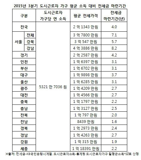 강남권은 전셋값이 4억3886만원으로 소득 대비 8.2년의 자금마련 기간이 소요된다. 강남 전세 아파트에 살기 위해서는 강북에서 보다 2.5년이나 더 모아야 하는 것이다.