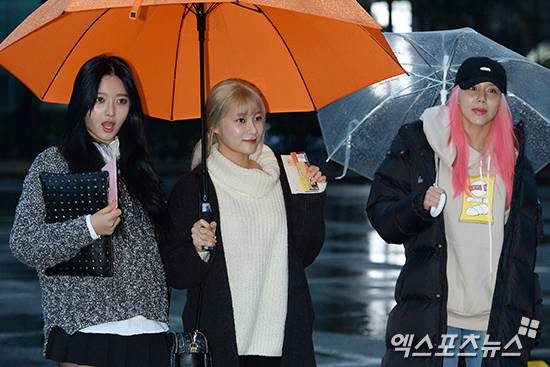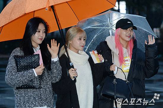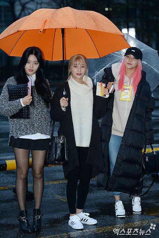 [엑스포츠뉴스=박지영 기자] 12일 오전 서울시 영등포구 여의도동 KBS신관에서 열린 '뮤직뱅크' 리허설 현장 출근길에 AOA 크림 찬미, 유나, 혜정이 포즈를 취하고 있다.