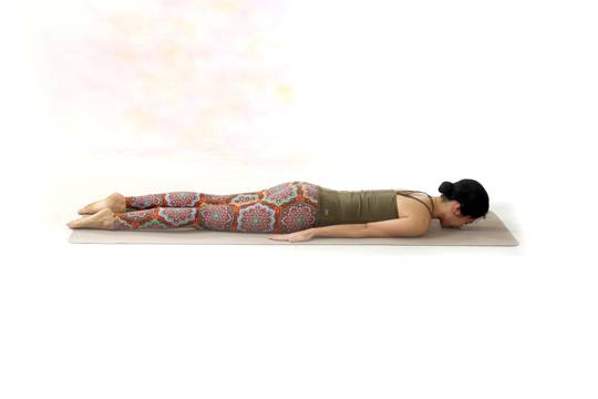 숨을 내쉬면서 가슴을 바닥에 편안한 쪽 귓불을 바닥에 둔다. 손바닥이 천장을 향하도록 하고, 팔꿈치를 살짝 구부려 어깨를 편안히 바닥에 기댄다. 두 발은 뒷꿈치가 바깥쪽을 향하도록 하고 엄지발이 안쪽으로 가까워지도록 한다.