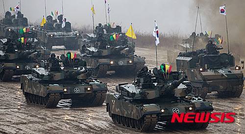 【여주=뉴시스】김동민 기자 = 12일 오전 경기도 여주 양촌리훈련장에서 K-2 전차, K-21 장갑차, K-9 자주포, K-30 복합비호 등 다양한 장비들이 '육군 기계화부대 전투장비 기동훈련'을 하고 있다. 2016.02.12.