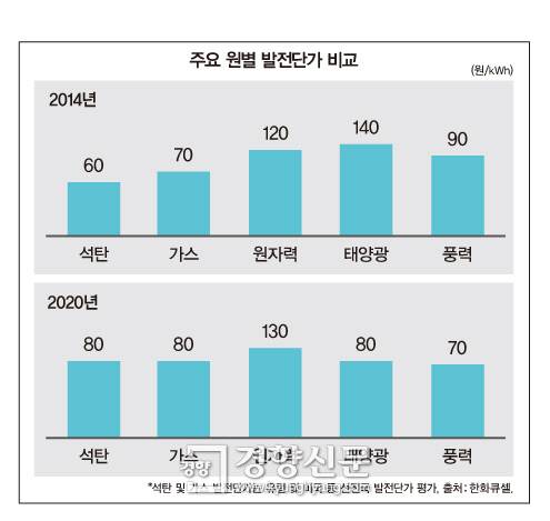 업계는 현재 그리드 패러티가 kWh당 120~130원 정도로 추산한다. 유럽, 미국 등 선진국의 경우 2014년 기준 kWh당 석탄은 60원, 가스는 70원, 원자력은 120원인 데 비해 태양광은 140원이다. 반면 풍력은 이미 90원으로 떨어졌다. 그리드 패러티는 2020년쯤 예상된다. 석탄과 가스는 80원, 원자력은 130원인 데 비해 태양광은 80원, 풍력은 70원까지 떨어져 역전될 것으로 예측된다.