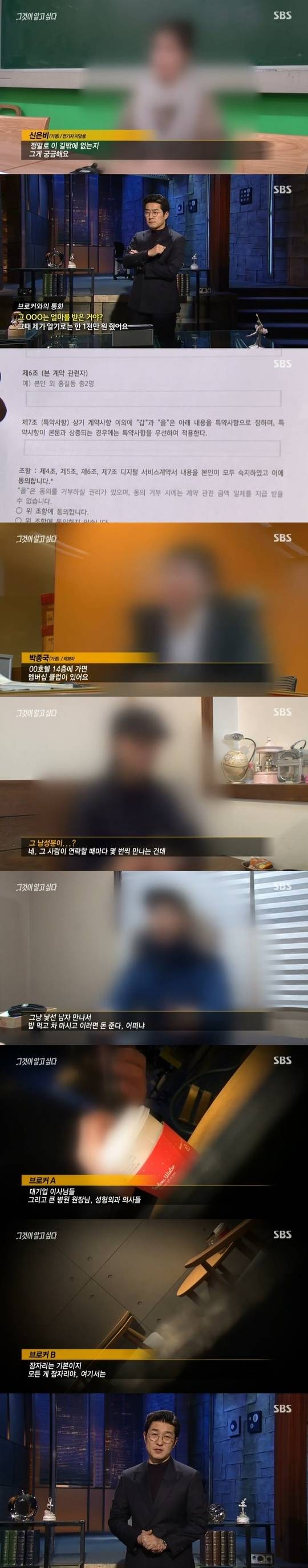 브로커 B는 한 미용실에 마련된 작은 응접실에서 "코트 벗고 서 봐. 히프는 업 돼 있네. 가슴 크네"라며 노골적이 멘트를 쏟아내더니 "잠자리는 기본이다. 모든 것이 잠자리다. 한 달에 천 만원 선불로 받고 네 다섯 번 정도 만남을 가지면 된다. 기본적으로 일단 마음에 들어야 하기 때문에 서로 밀당을 해야 한다. 마음에 들면 여기서 돈을 주고 마음에 안 들면 끝난다"며 "돈 많은 사람, 부자들 다 연결 돼 있다. 너 하나 밀어주는거 일도 아니다. 성관계에 대한 환상을 깨고 많이 내려놔야 한다. 그렇지 않으면 힘들다. 무명으로 끝날 수도 있다"고 말했다.