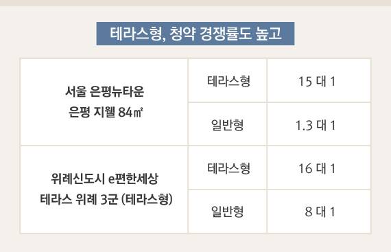분양시장에서 테라스는 효자 노릇을 하고 있다. 올 1월 신영이 서울 은평뉴타운에 분양한 은평 지웰 테라스의 최고 경쟁률은 테라스형 평면이 차지했다. 테라스가 있는 84㎡(이하 전용면적) D타입의 1순위 경쟁률은 16대 1이다. 테라스가 없는 일반 평면인 C타입은 1.3대 1에 그쳤다.