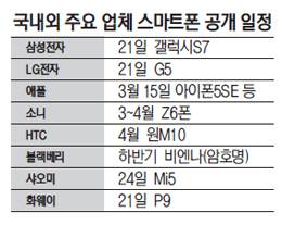 삼성전자와 LG전자가 이달 21일(유럽시간) '모바일월드콩그레스(MWC)'에서 각각 갤럭시 S7과 G5를 내놓으며 스마트폰 시장 선점에 나선다. 하지만 세계 고가 스마트폰시장을 휩쓰는 미국 애플이 3월에 신제품(아이폰5SE)을 공개하고, 타이완의 HTC와 캐나다의 블랙베리, 일본의 소니도 3~4월에 신제품을 내놓을 예정이어서 정면승부는 3월 이후 본격화될 전망이다. 여기에 글로벌 스마트폰 판매량 3위인 중국 화웨이도 삼성, LG와 같은 날 중저가 신제품을 발표하고 샤오미도 MWC에서 미5(Mi5)를 내놓을 예정이어서 다크호스로 떠오르고 있다.