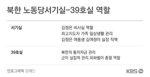 북한의 노동당 서기실은 김정은 국방위 제1위원장의 비서실 역할을 하는 곳이다. 최고 지도자와 가족들의 일상생활을 돌보는 일 등을 하는 곳으로 알려져 있으며, 현재 김정은의 여동생 김여정이 서기실장을 맡고 있는 것으로 알려져 있다. 북한 노동당 39호실은 1970년대 중반에 조직된 북한의 통치자금 관리기구로 알려져 있다. 군이 실질적으로 관리해 온 외화벌이 총괄 역할을 하는 조직으로, 국제사회의 제재를 받고 있는 곳이기도 하다.
