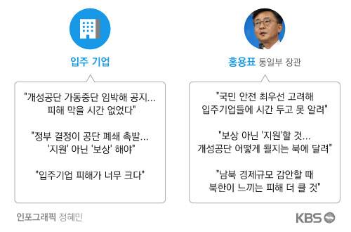 정부의 각종 지원책에 대해 개성공단 입주 기업들은 피해 지원이 아닌 '보상'을 요구하고 있다. 정부의 결정으로 폐쇄가 이어진 만큼 정부가 책임을 지고 '지원'이 아닌 '보상'을 해야 한다는 것이다.하지만 홍 장관은 피해보상이냐 지원이냐는 질문에 "지원"이라고 못박았다. "개성공단이 어떻게 될 지는 기본적으로 북한에 달려있다"며 "(재가동을 상정하고 피해 지원을 하는지 여부는) 추후에 결정할 사안들이고 일단은 기업 피해를 파악해 지원을 신속하게 하려고 한다"고 답했다.